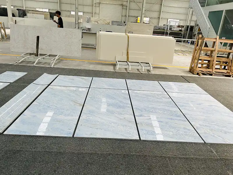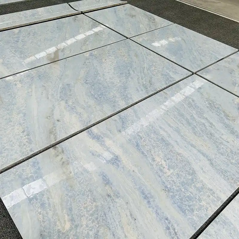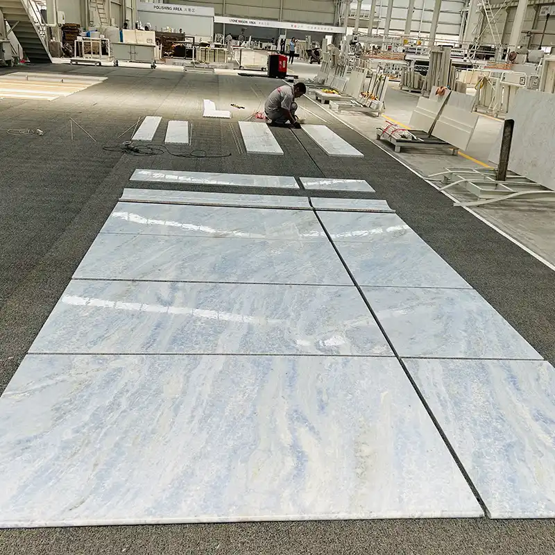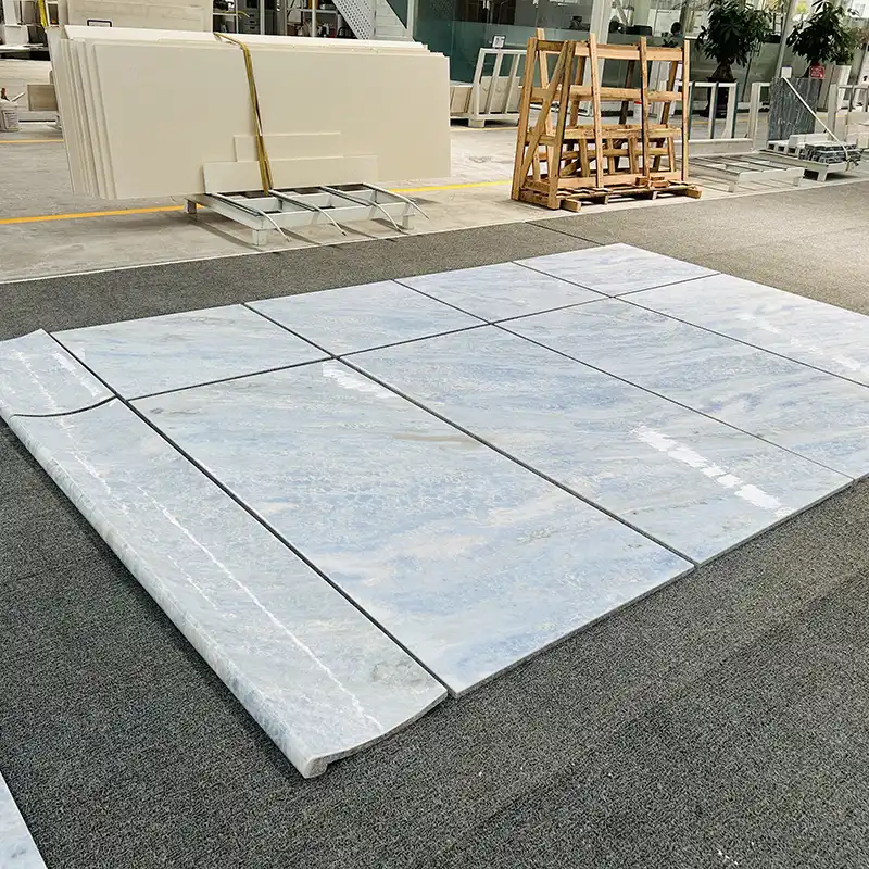 Kalcitblå ekstra marmorvægfliser har en lys, frisk blå farve med afbalanceret, krystallignende vene, i modsætning til mange mørkere eller overdrevent mønstrede blå kugler. Det får indersiden til at føle sig lettere og roligere, mens den stadig ser klassisk ud.