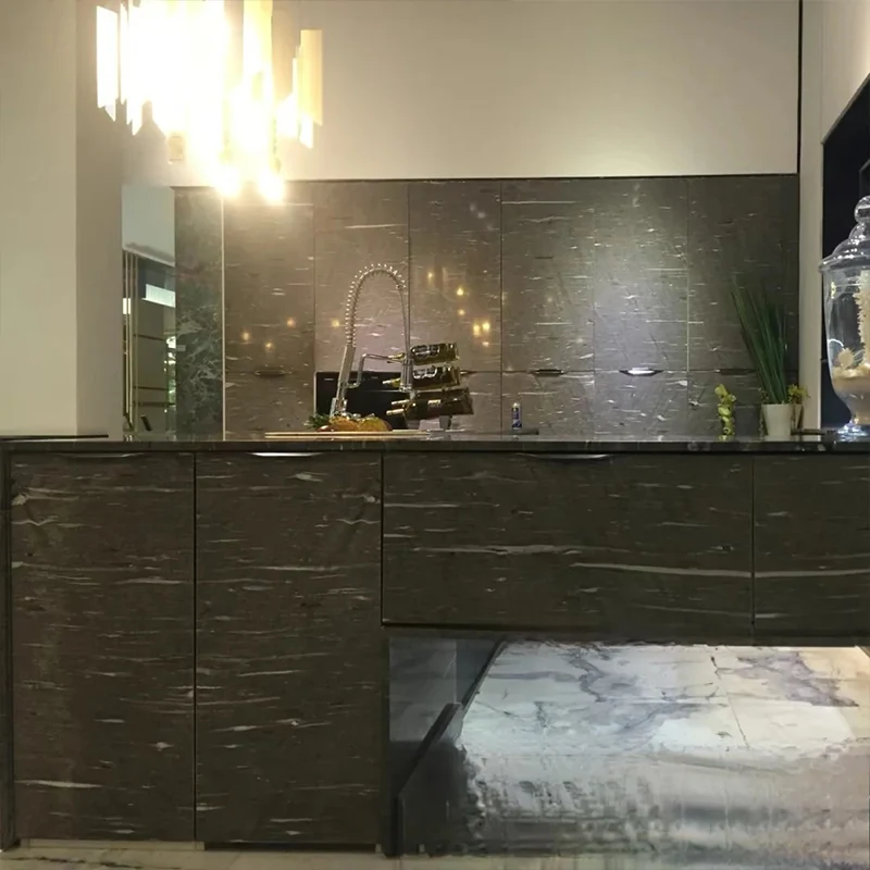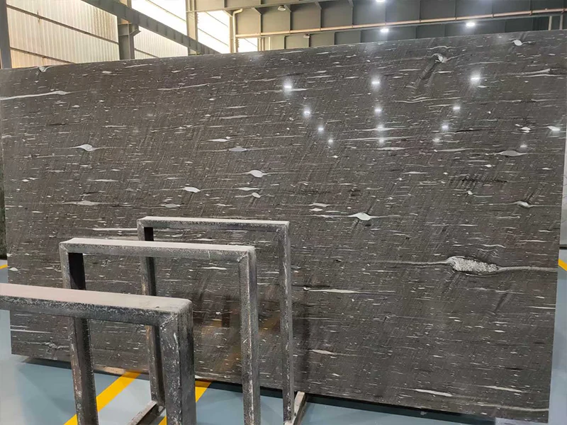 Black Silk Granite er et specielt materiale til avanceret interiørdesign, da dens mørke sorte farve står i kontrast til sølv og hvid vener.