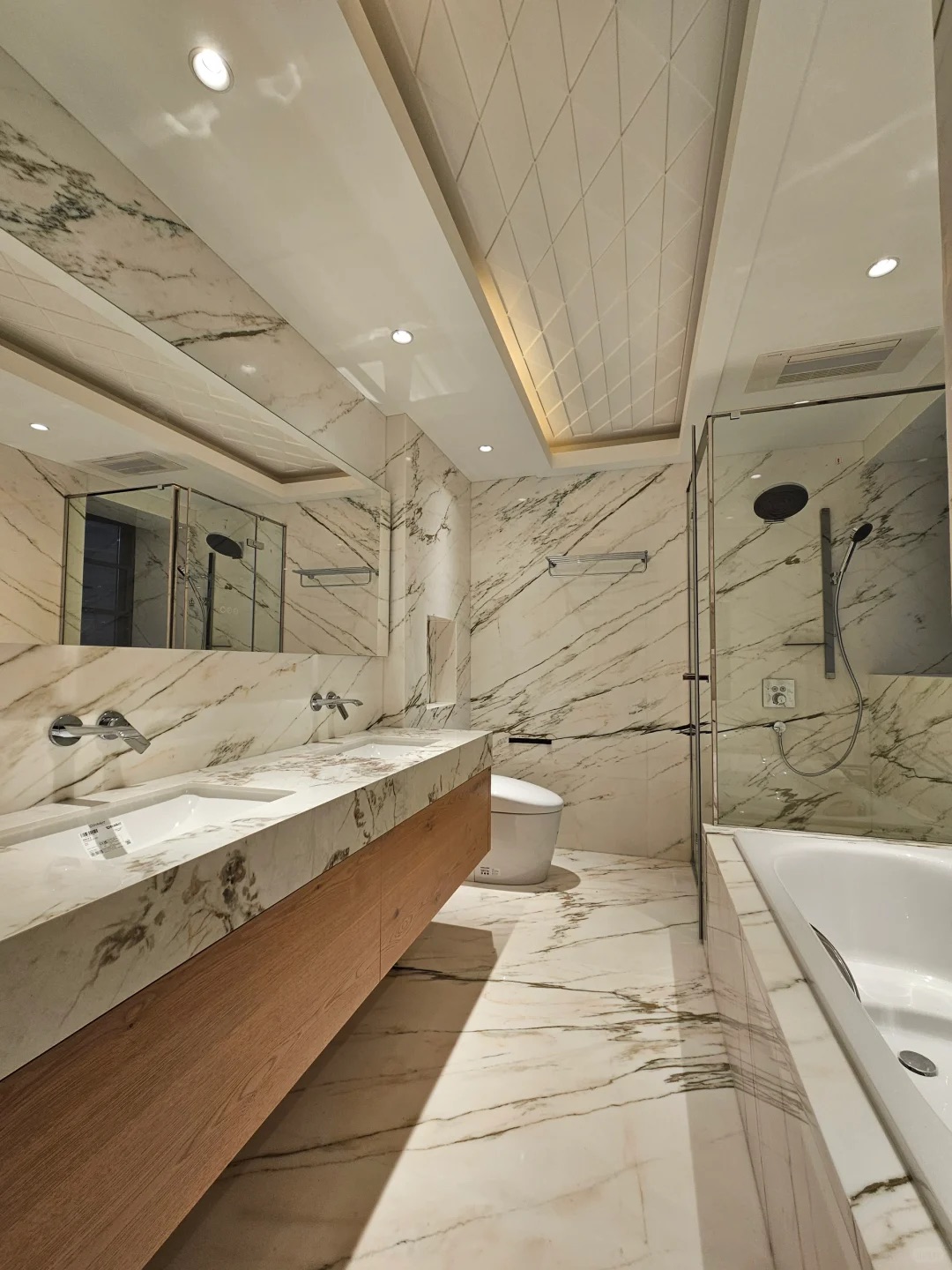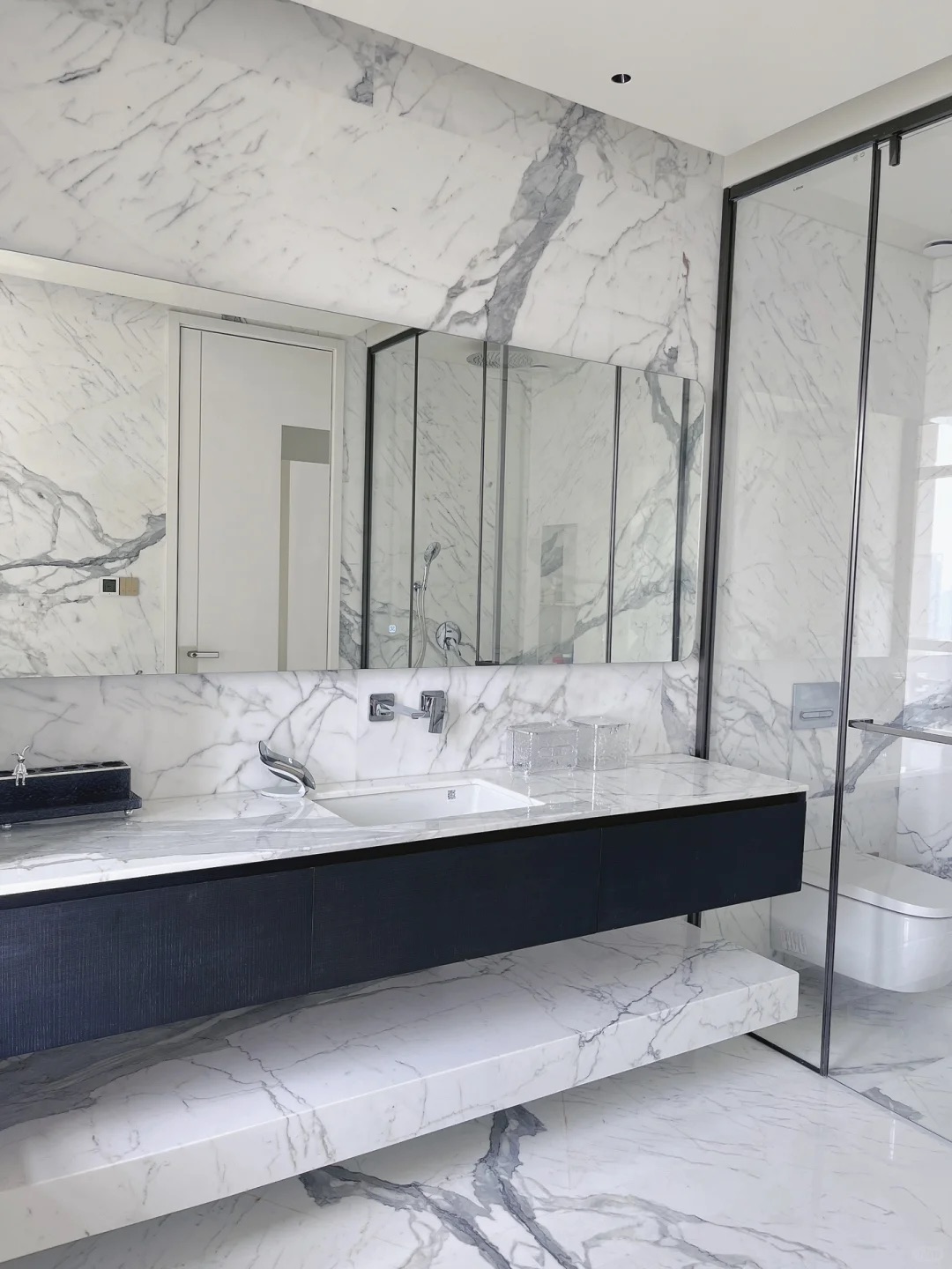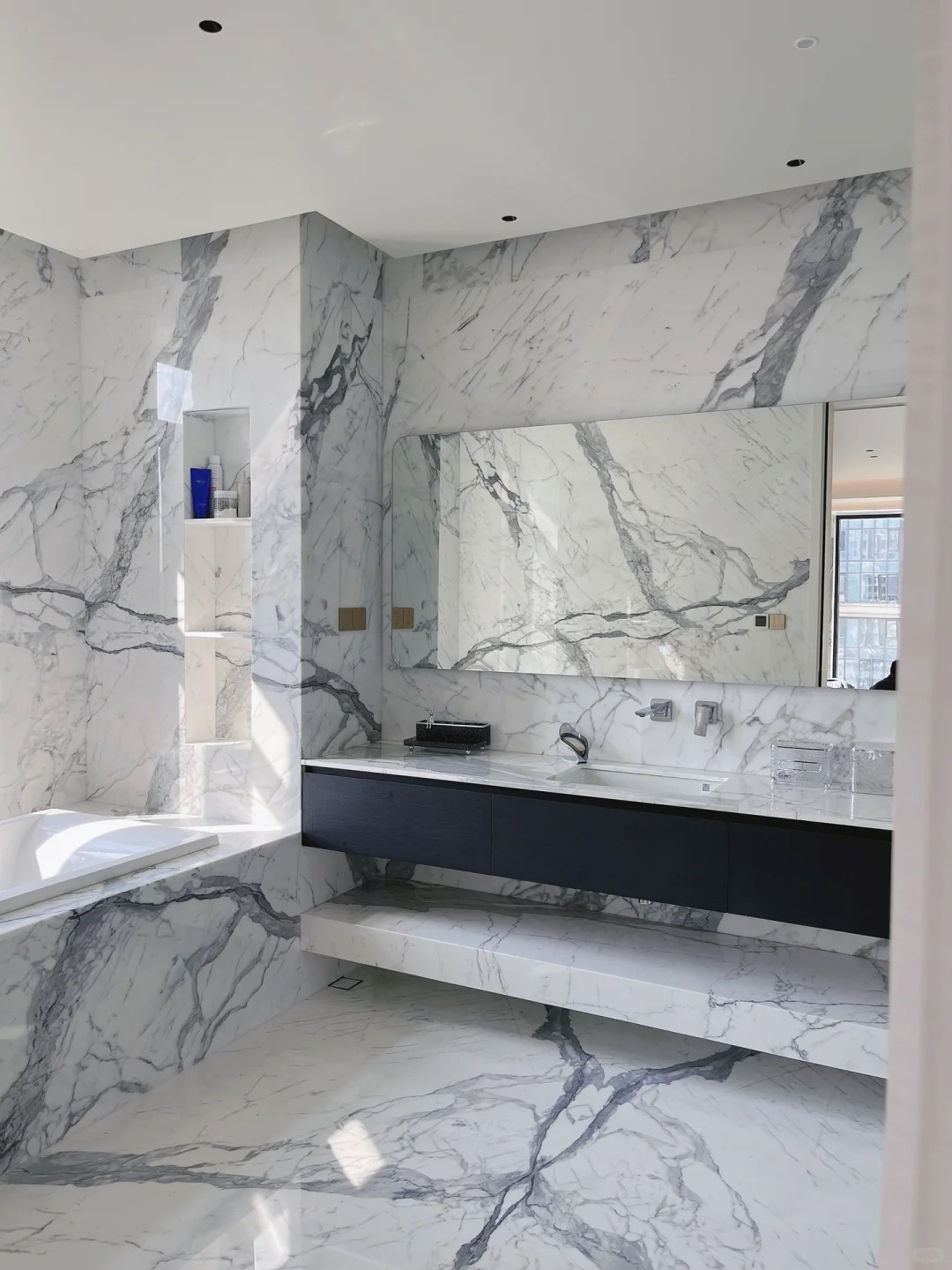 Med udsagn badeværelse stenbordplader eller marmor badeværelse indretning er calacatta marmor ideel, da det har mere dramatisk vene. Det stærke udseende af et Calacatta -marmorbadeværelse supplerer moderne luksusdesign godt.
