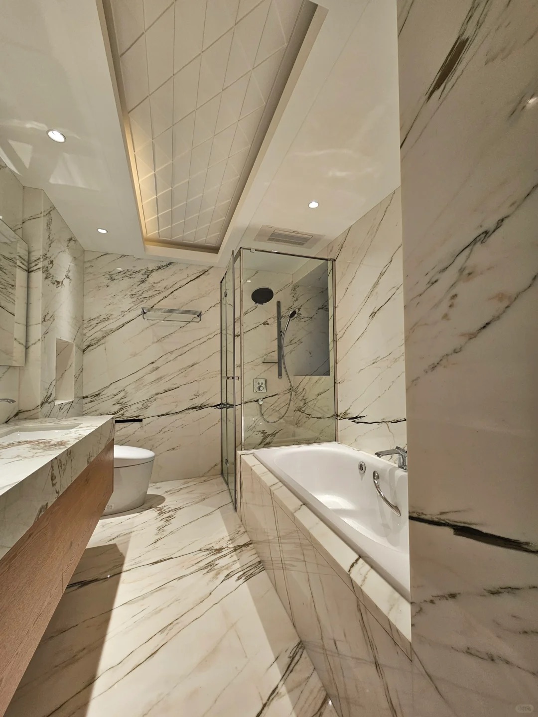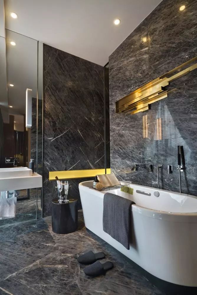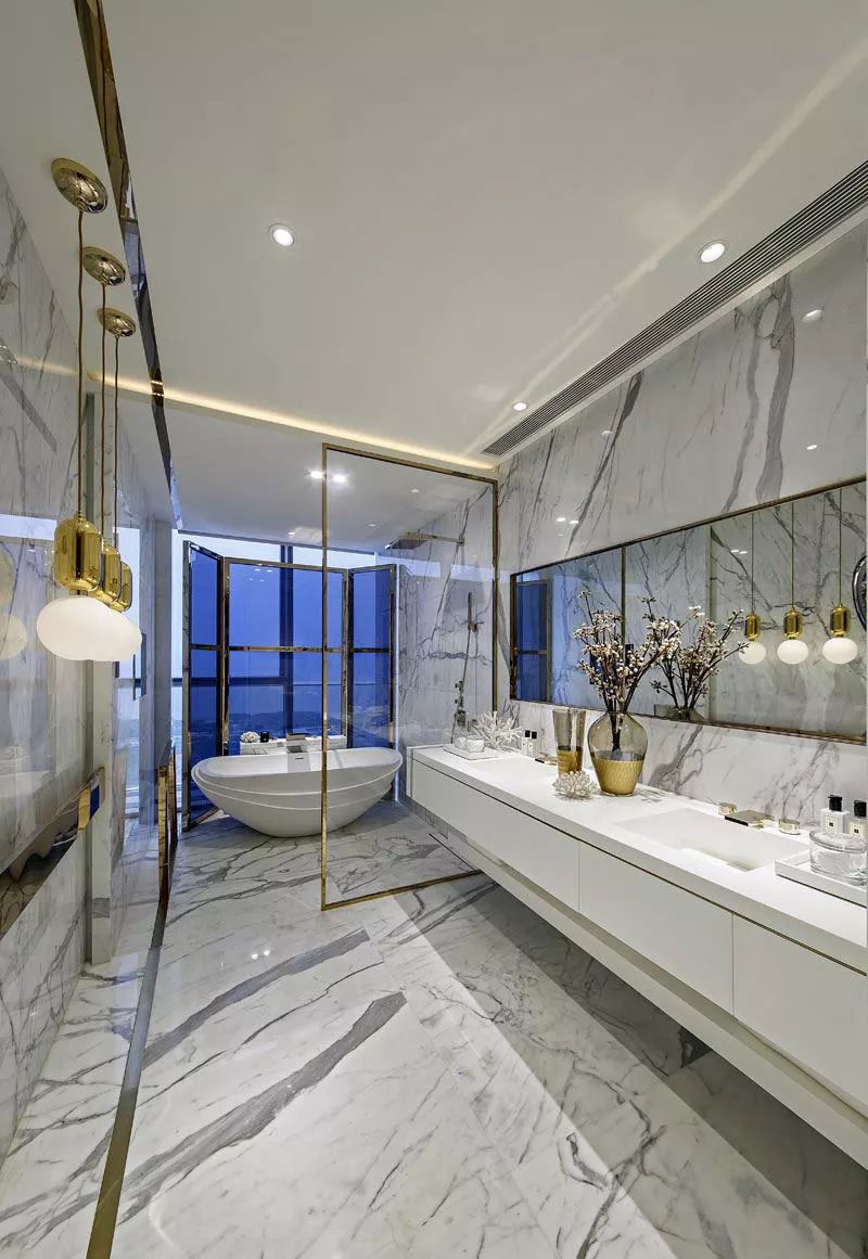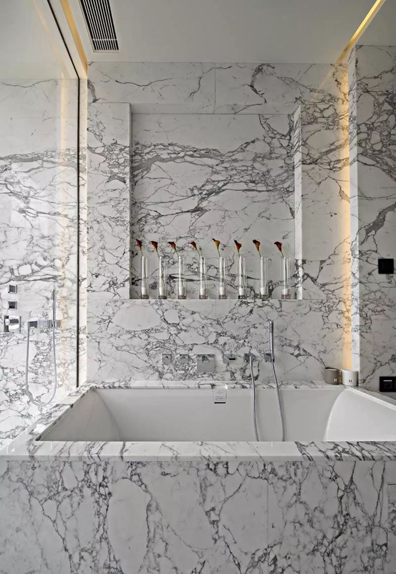 Med udsagn badeværelse stenbordplader eller marmor badeværelse indretning er calacatta marmor ideel, da det har mere dramatisk vene. Det stærke udseende af et Calacatta -marmorbadeværelse supplerer moderne luksusdesign godt.
