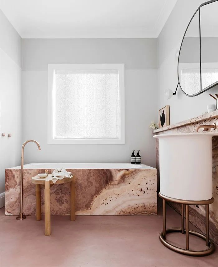 Pink marmor badeværelsesdesign giver et blidt og udsøgt touch til et romantisk eller kreativt område.