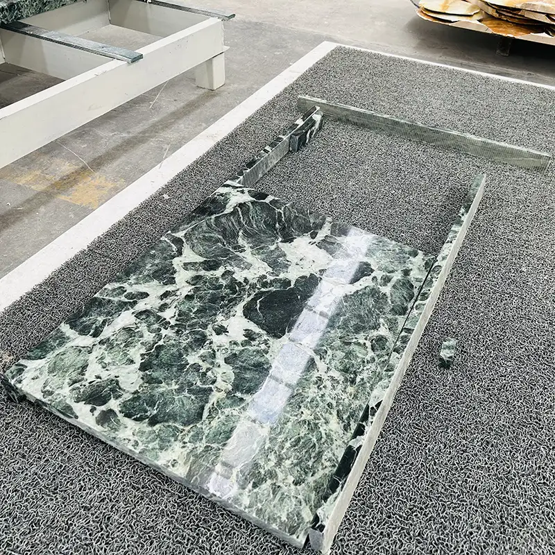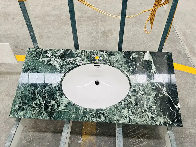 Vi er meget opmærksomme på enhver brugerdefineret marmor forfængelighedstop, vi laver, uanset hvilken form eller størrelse den er. Dette inkluderer valg af den rigtige Verde -marmorflise eller plade, polering af den, emballering af den og forsendelse.